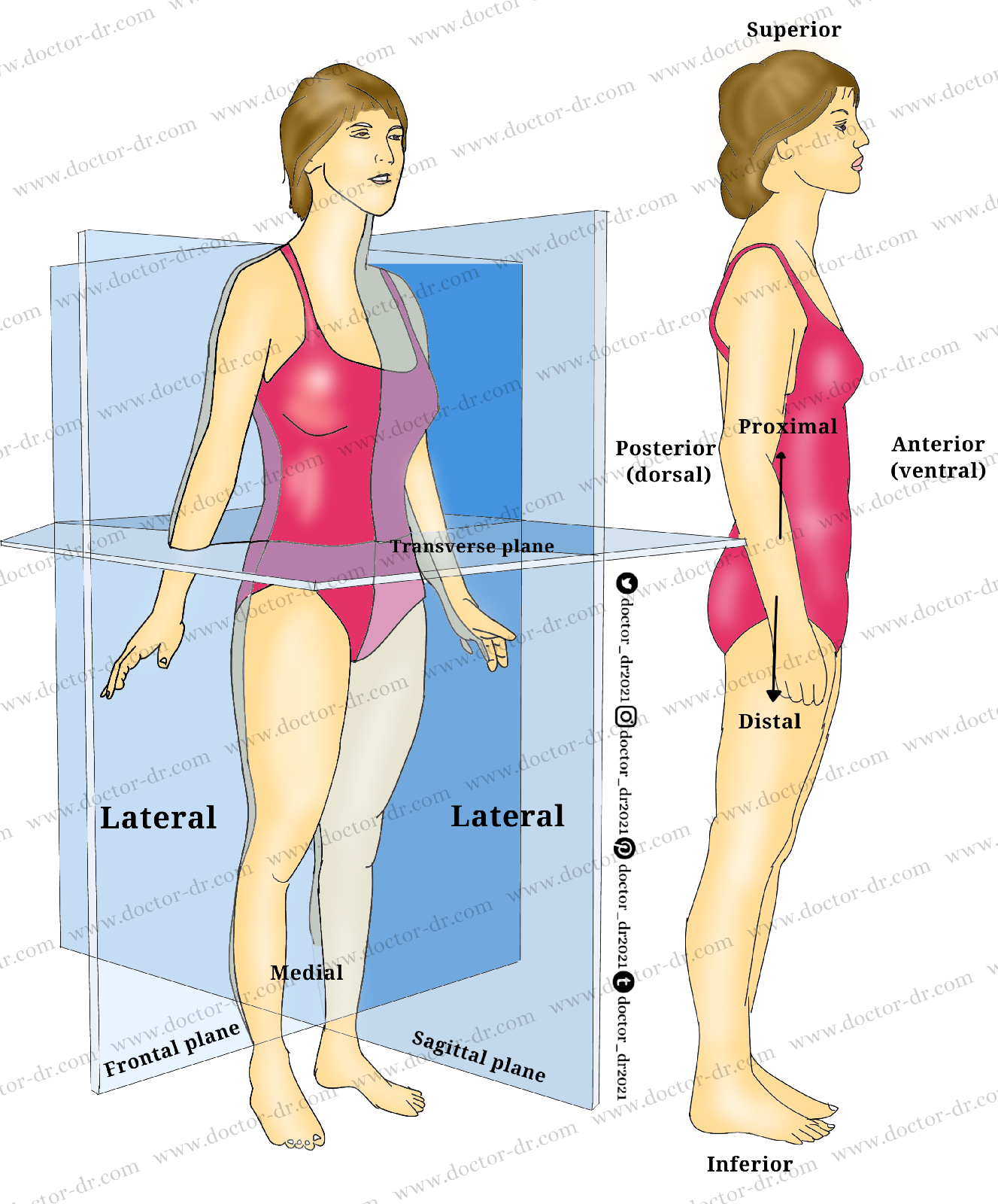 There are two halves to the body: the front and the back. Anterior refers to the "front" or "in front of," whereas posterior refers to the "back" or "behind." Ventral (toward the belly) can be used in place of anterior, and dorsal (toward the back) can be used in place of posterior among people who walk upright. The nose, for example, is on the body's front side, whereas the shoulder blades are on its posterior surface.